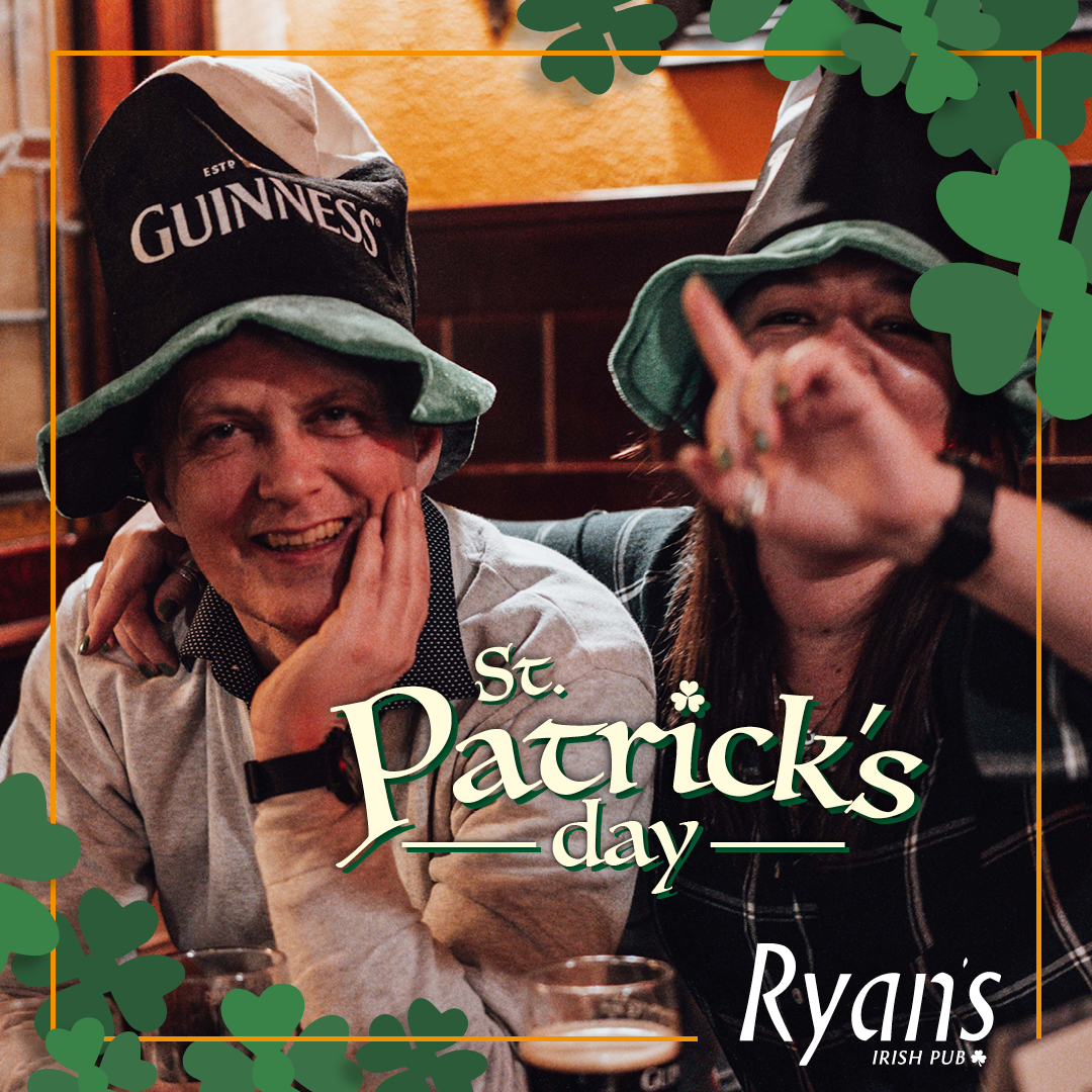 Skt. Patricks Dag er den irske nationaldag, der fejres verden over d. 17. marts. På Ryan’s fejrer vi det i weekenden d. 13. – 14. marts 2026 og selvfølgelig også tirsdag d. 17. marts 2026.